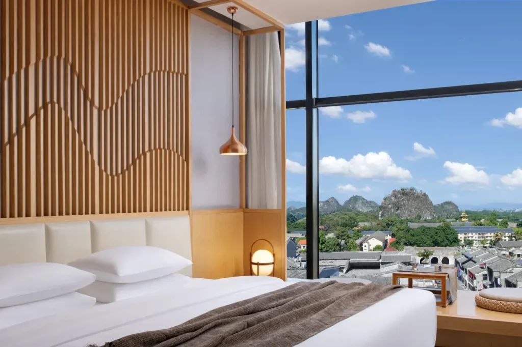 - Mountain-view suites with floor-to-ceiling windows capturing Guilin’s famed karst peaks.
